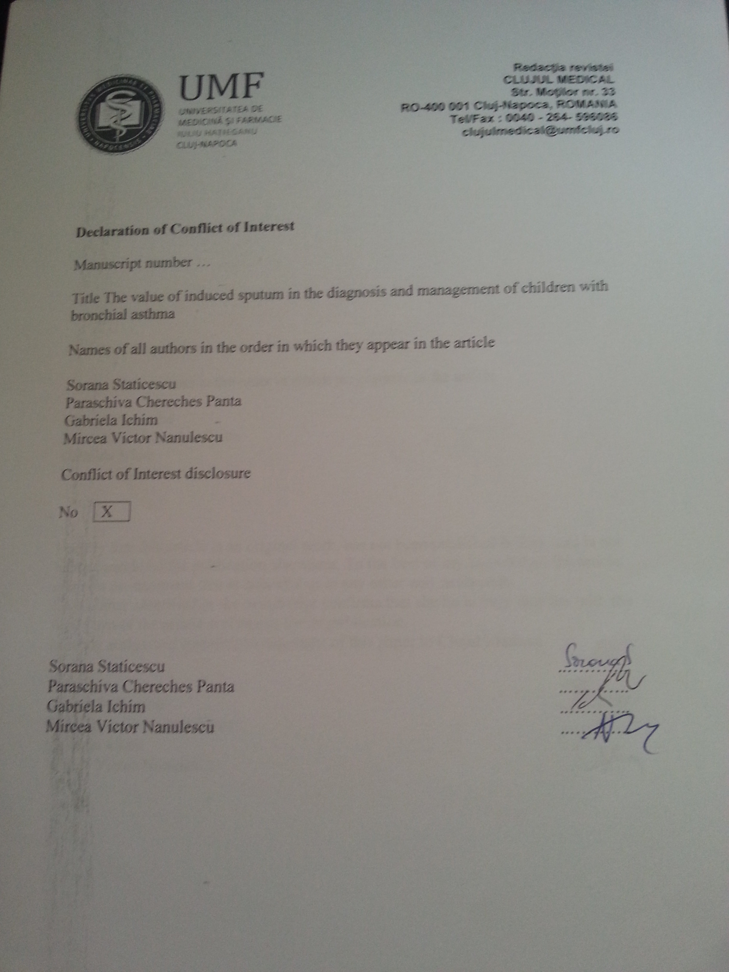Results: In patients with partially controlled asthma and those with uncontrolled asthma, the eosinophils percentage in the sputum was higher than in patients with controlled asthma (19.8±26.4% respectively 9.2±20.5% versus 4.5±14.6%, p<0.001). Higher percentage of neutrophils in the sputum was found in the partially controlled and uncontrolled asthma than in the controlled asthma (43.9±20.1% respectively 51.6±38.3% versus 35±19.7%, p=0.009). We also evidenced a direct and statistically significant correlation between the exhaled nitric oxide and the neutrophils percentage in the sputum (r=0.67, p=0.0003). Also, an indirect, moderate to good correlation (r=-0.56, p=0.005) was evidenced between the values of the forced expiratory volume in 1 second and the high eosinophils percentage in the sputum.