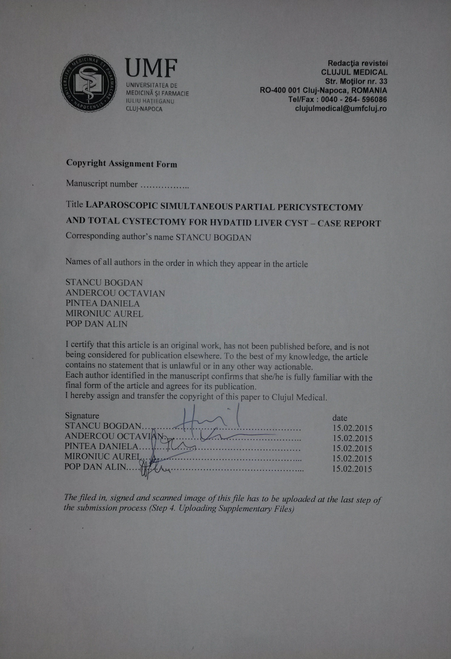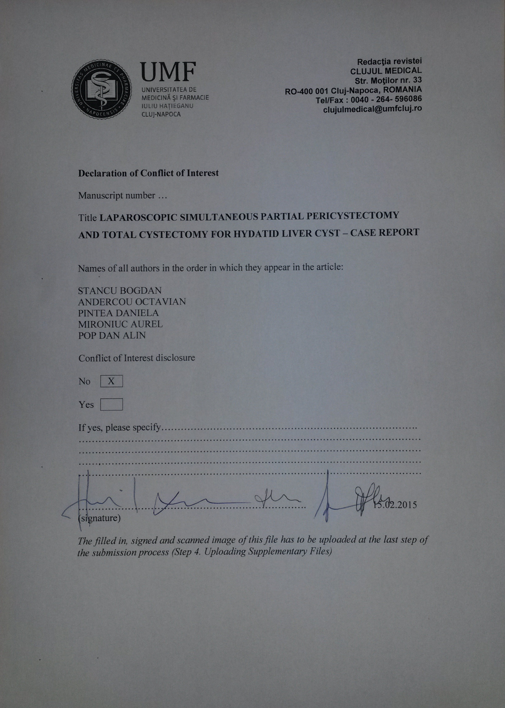 LAPAROSCOPIC SIMULTANEOUS PARTIAL PERICYSTECTOMY AND TOTAL CYSTECTOMY FOR HYDATID LIVER CYSTS – CASE REPORT