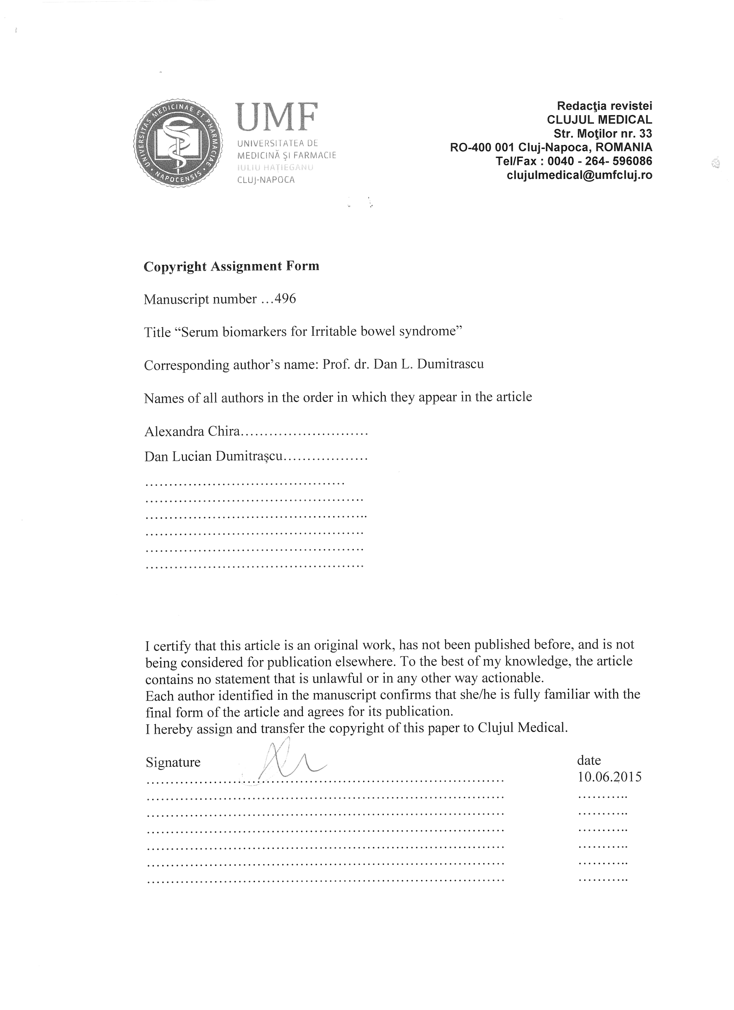 The authors are required to transfer the copyright of the published paper to the journal. This is done by agreeing to sign the Copyright Assignment Form. Whenever the case, authors are also required to send permissions to reproduce material (such as illustrations) from the copyright holder.