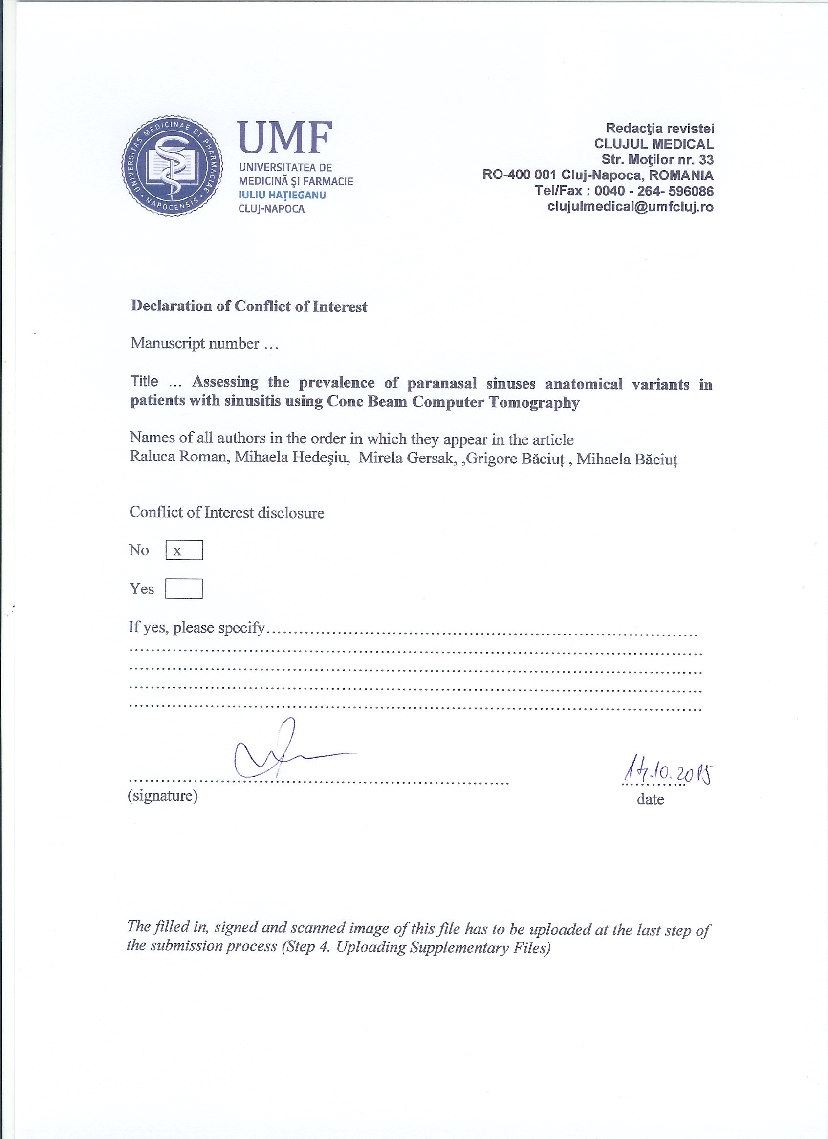 Conclusion: The anatomical variants of the paranasal sinuses are not incidental, being found in a large number of patients and may be a predisposing factor in the onset and recurrence of sinuses inflammation. The CBCT technique, due to the finest multiplanar reconstruction, permits a very good pre-therapeutic assessment of these predisposing conditions.