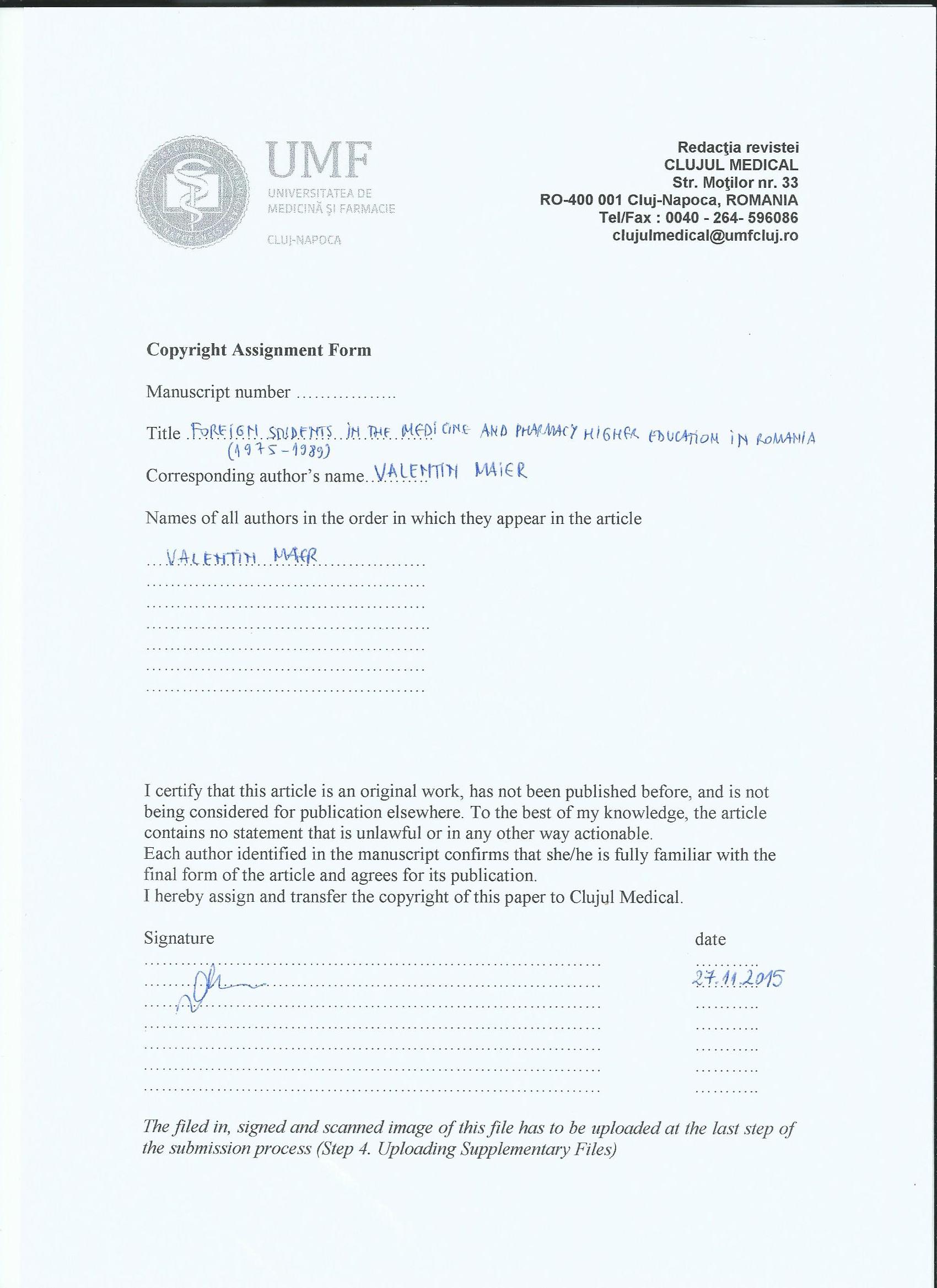 The authors are required to transfer the copyright of the published paper to the journal. This is done by agreeing to sign the Copyright Assignment Form. Whenever the case, authors are also required to send permissions to reproduce material (such as illustrations) from the copyright holder.