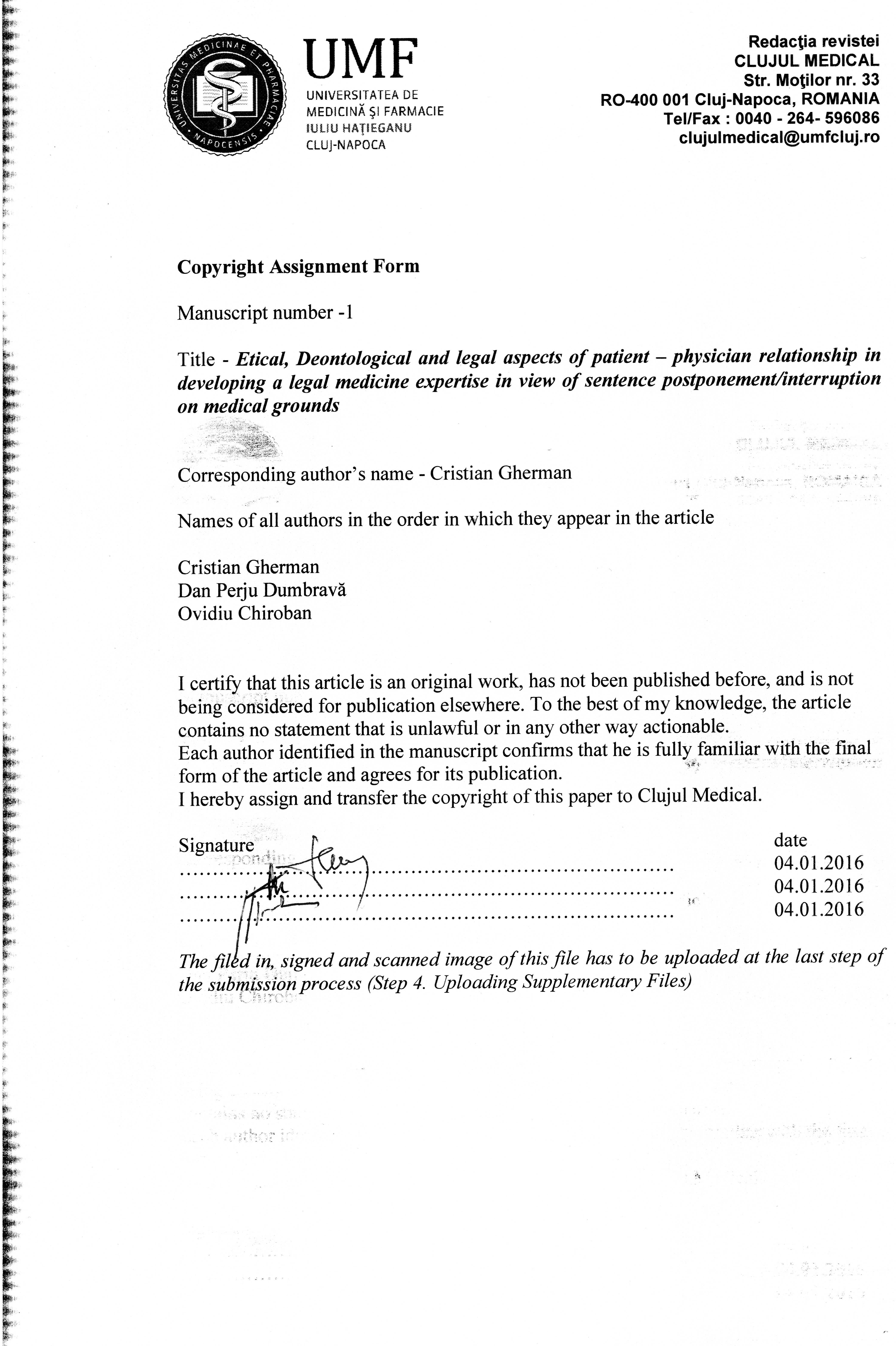 The authors are required to transfer the copyright of the published paper to the journal. This is done by agreeing to sign the Copyright Assignment Form. Whenever the case, authors are also required to send permissions to reproduce material (such as illustrations) from the copyright holder.