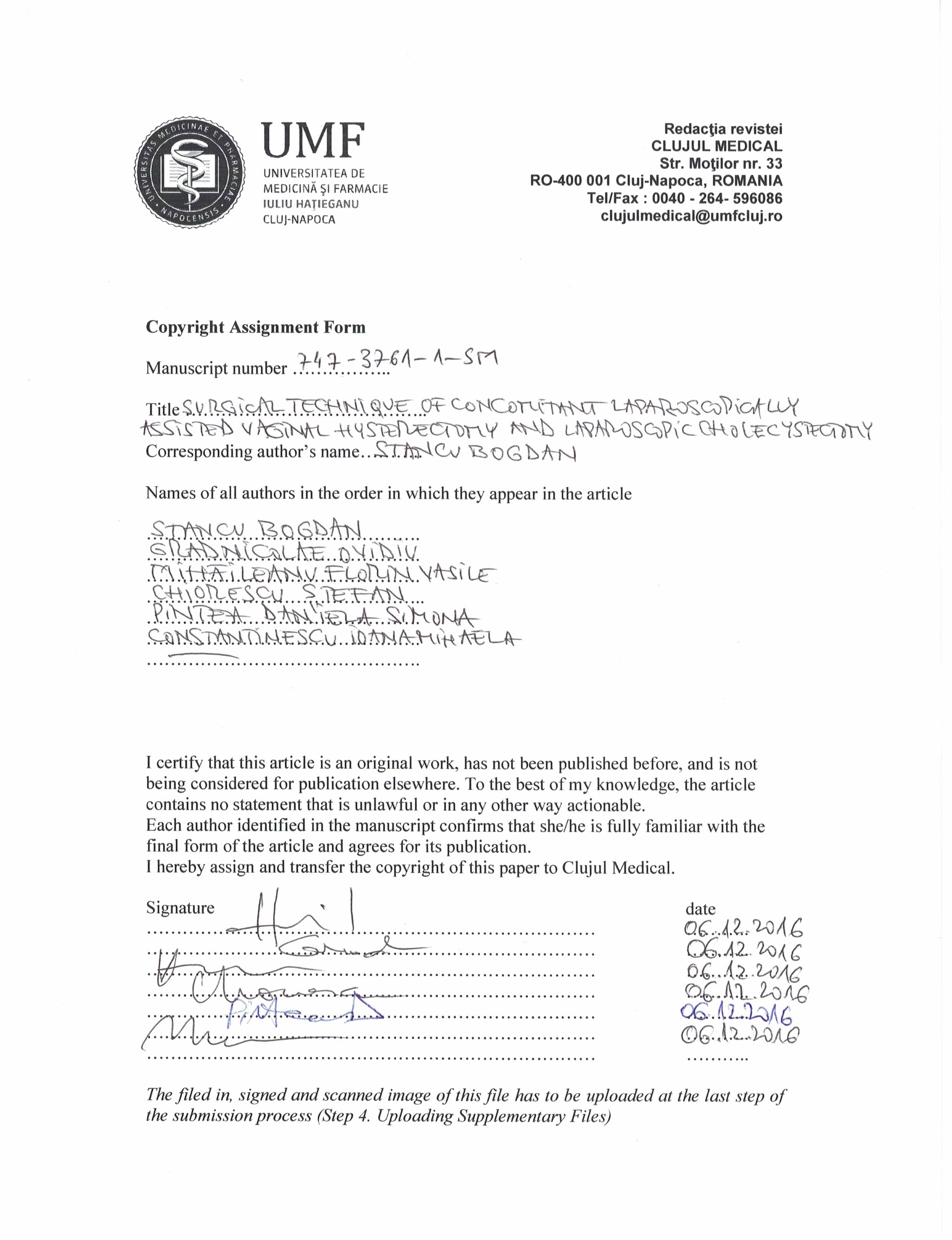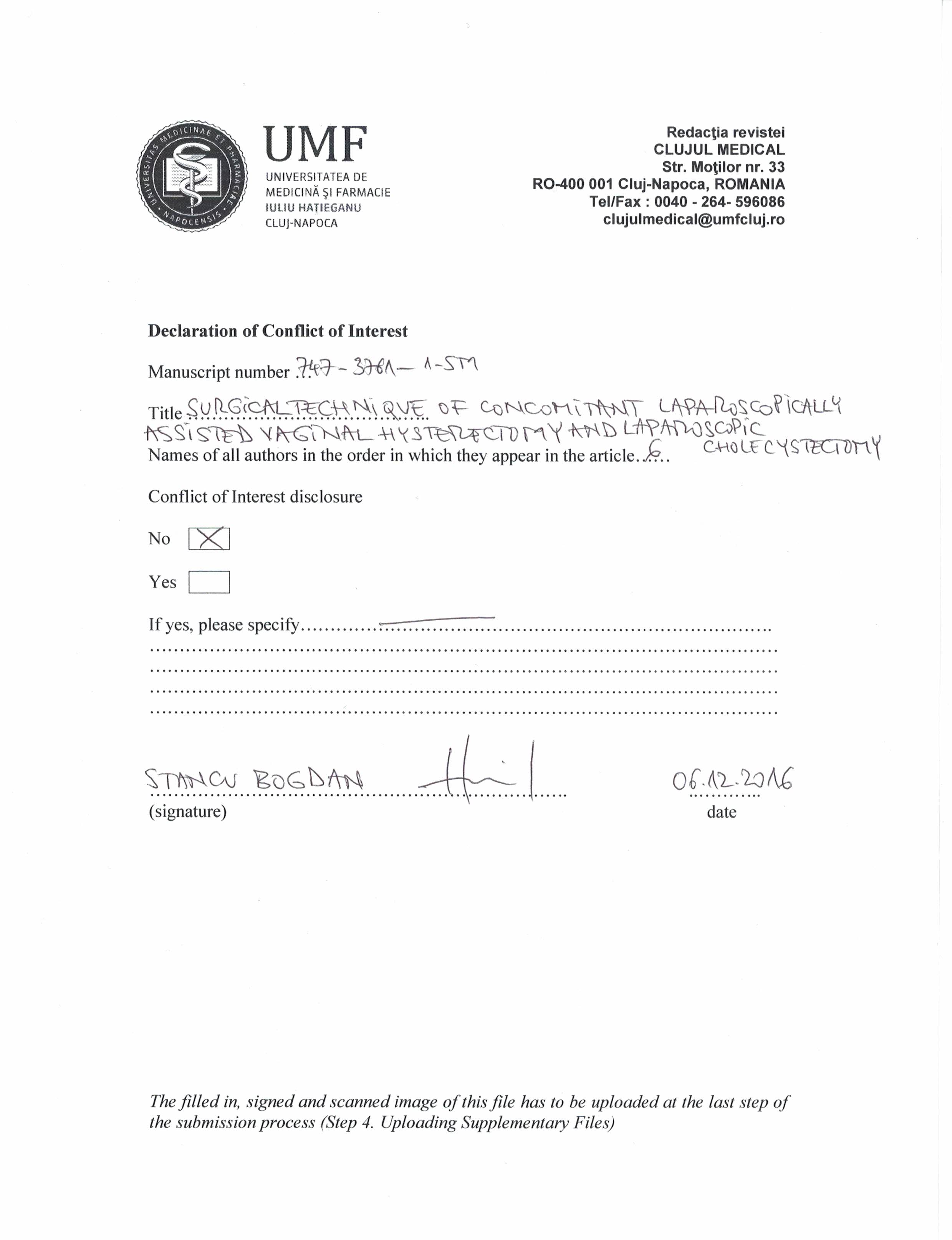 Case presentation. We practiced in some selected cases simultaneous laparoscopically assisted vaginal total hysterectomy with bilateral adnexectomy and laparoscopic cholecystectomy using 5 trocars without uterine manipulator. Previous examinations included abdominal ultrasound, cervix biopsy and CT of abdomen and pelvis.