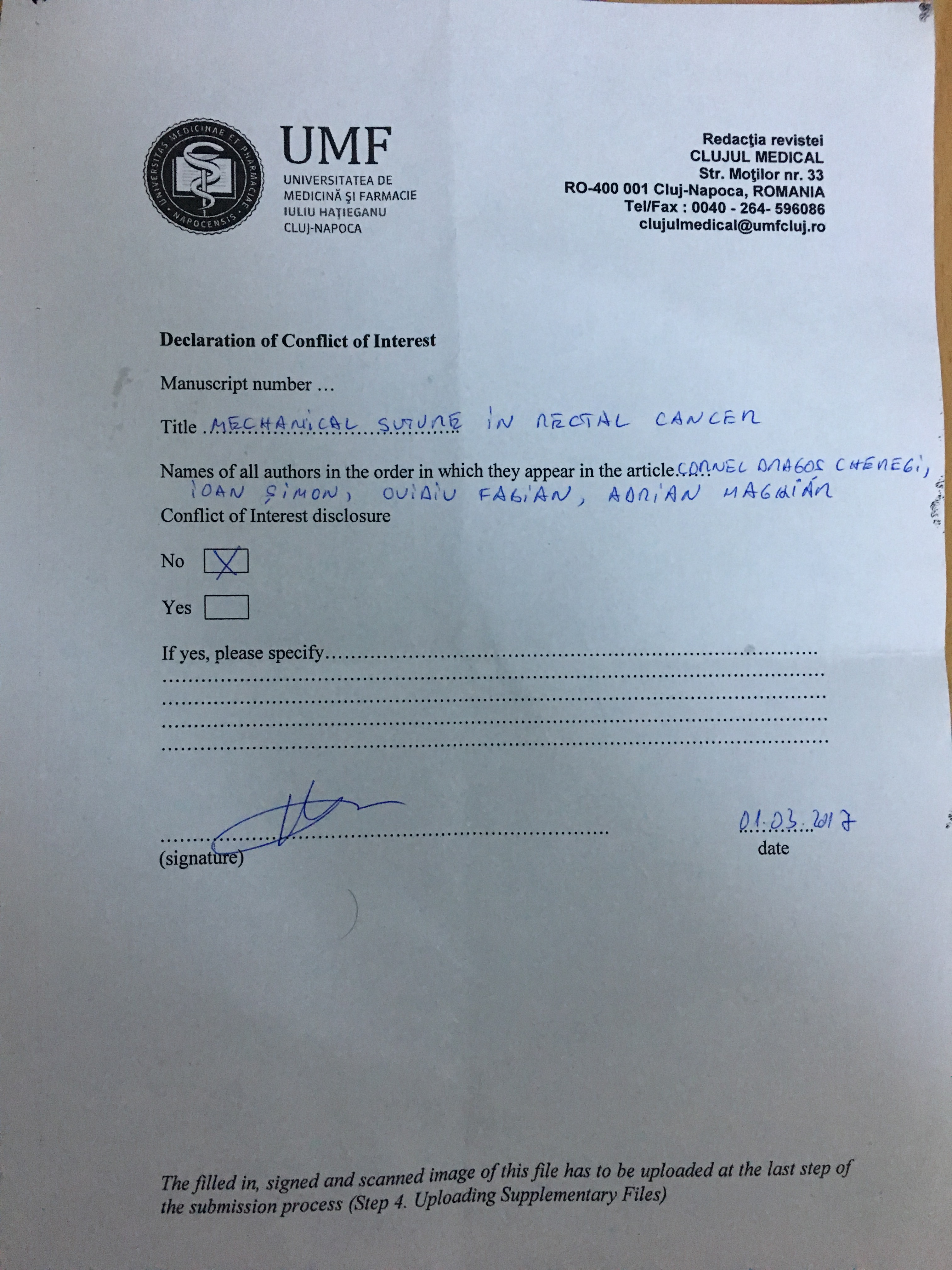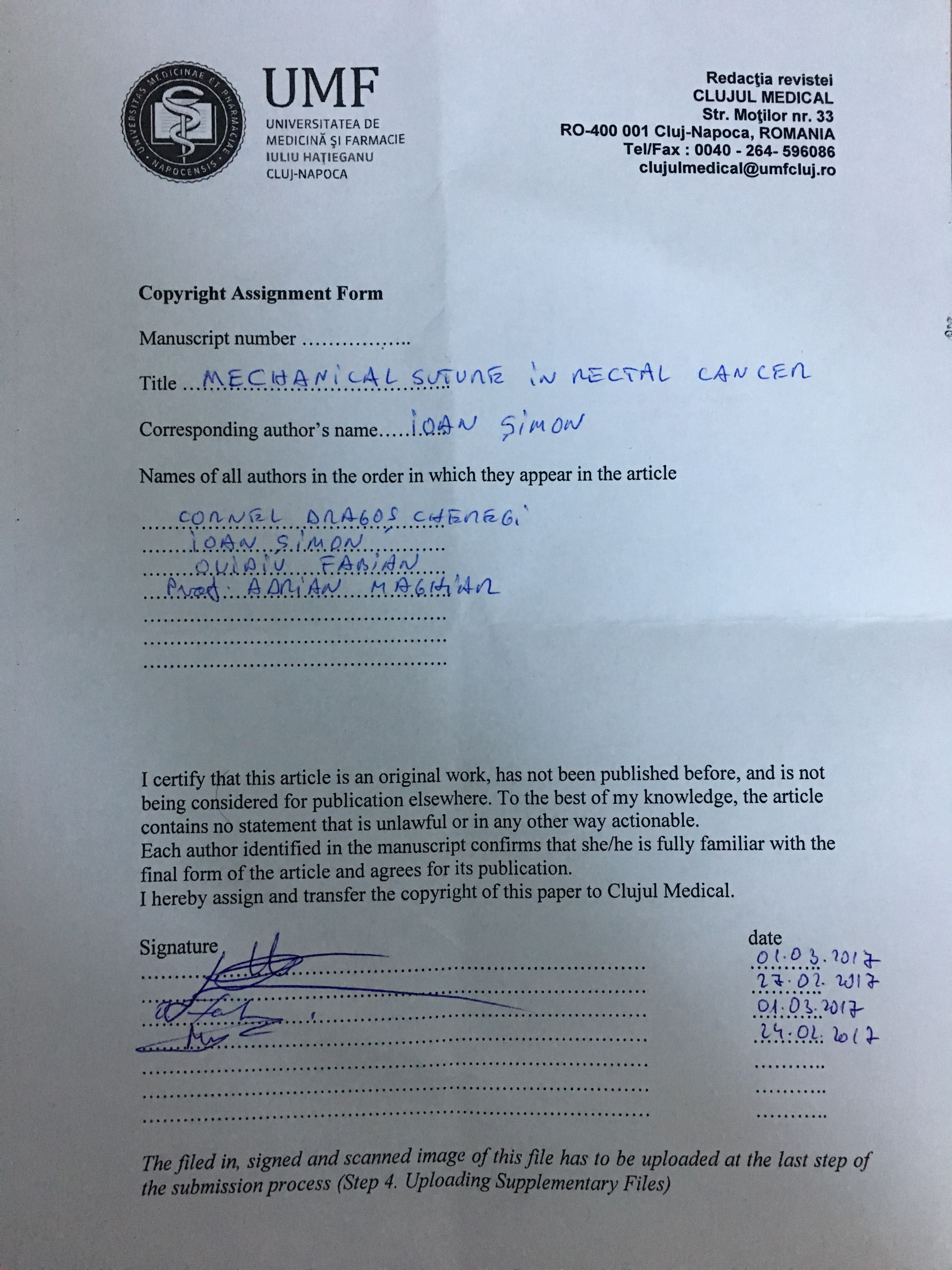 Background and aims. Colorectal cancer is one of the most frequent digestive malignancies, being the third cause of death by cancer, despite early diagnosis and therapeutic progress made over the past years. Standard treatment in these patients is to preserve the anal sphincter with restoration of intestinal function by mechanical colorectal anastomosis or coloanal anastomosis, and to maintain genitourinary function by preservation of hypogastric nerves.