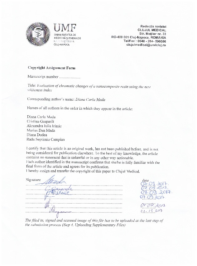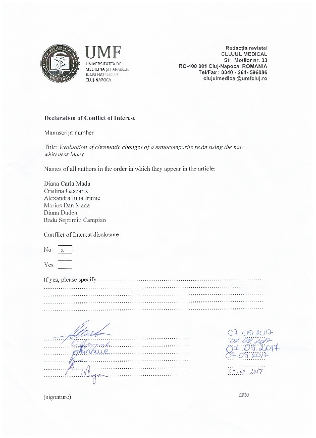 Conclusions. The chromatic changes of the nanocomposite resin could be evaluated by the variation of the whiteness index. The staining effect induced by the two types of coffee was similar. The most effective protocol was the in-office bleaching method based on Beyond 35%.