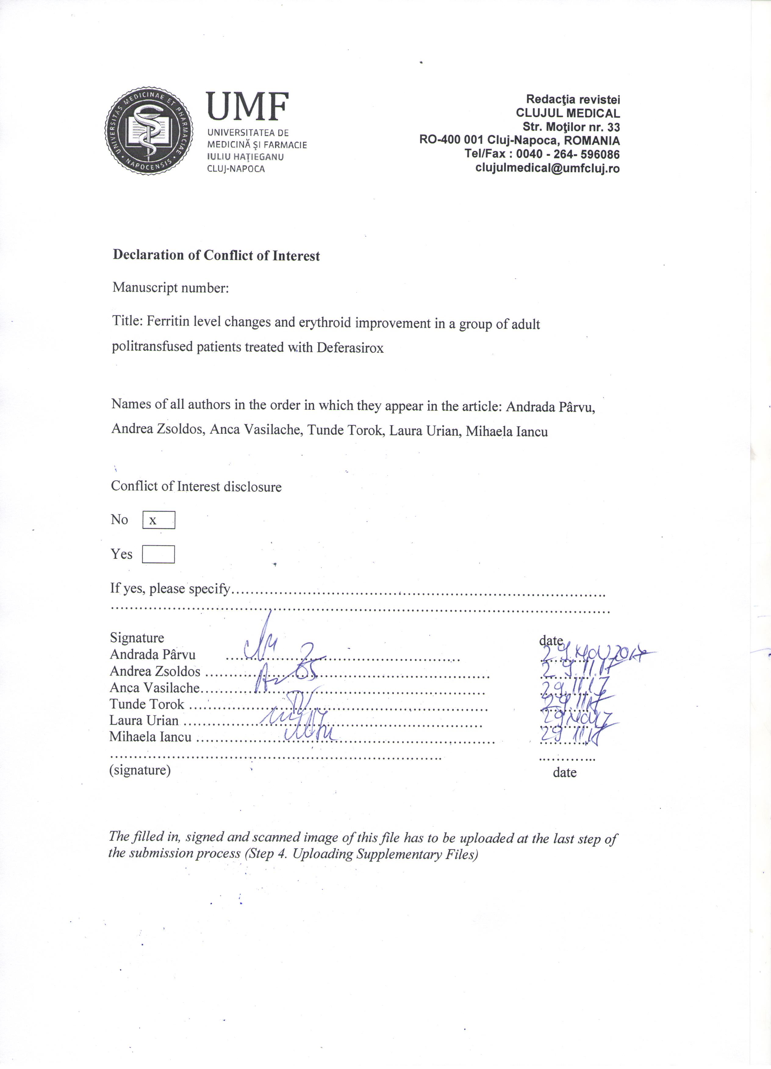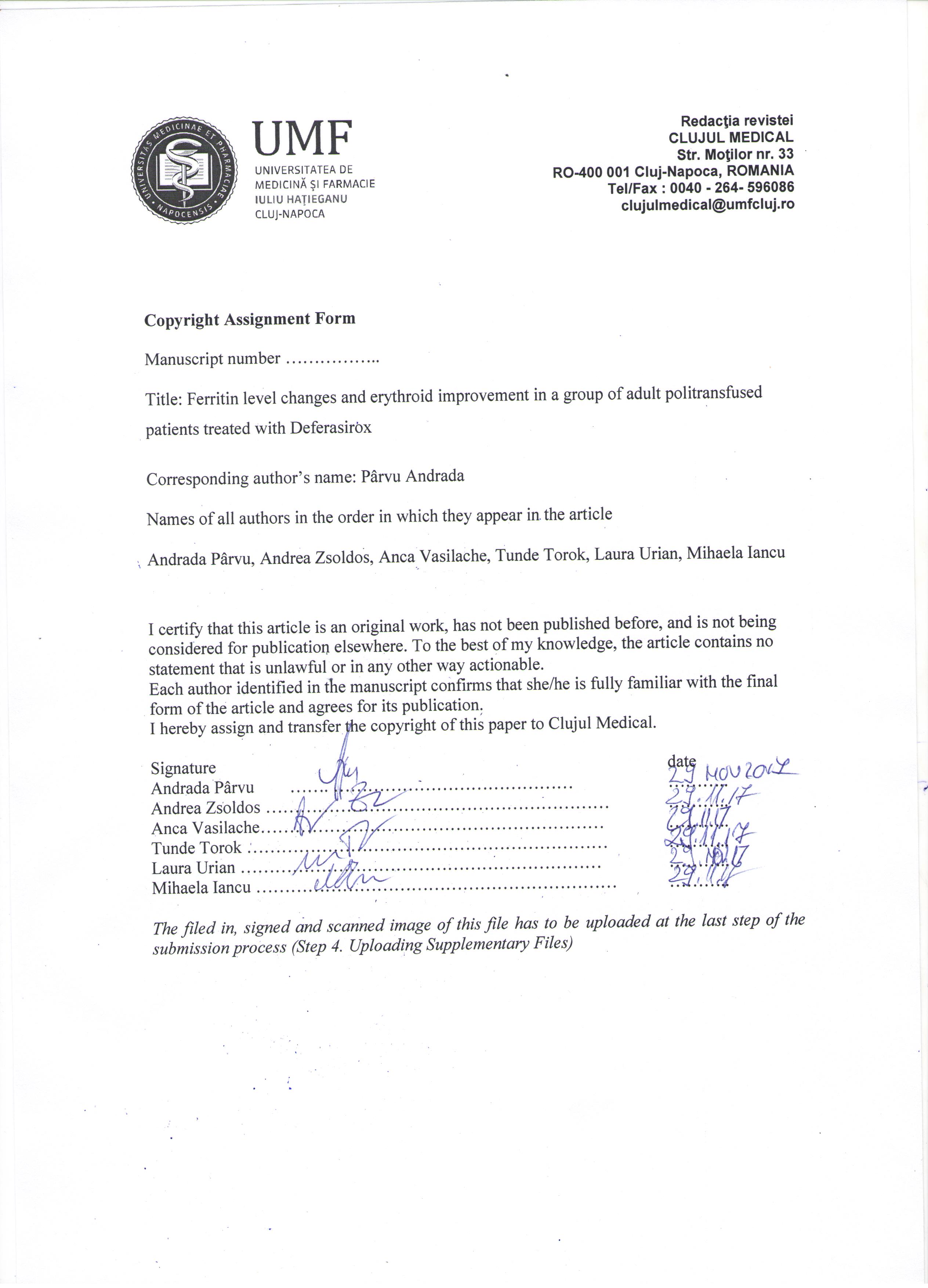 Methods. Retrospective study including all the adult polytransfused patients treated with Deferasirox in Hematology Departments of three county hospitals in the North-West of Romania.